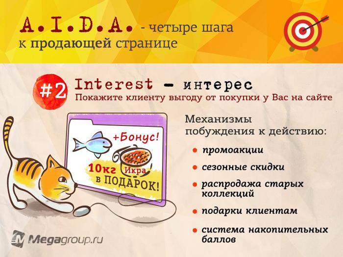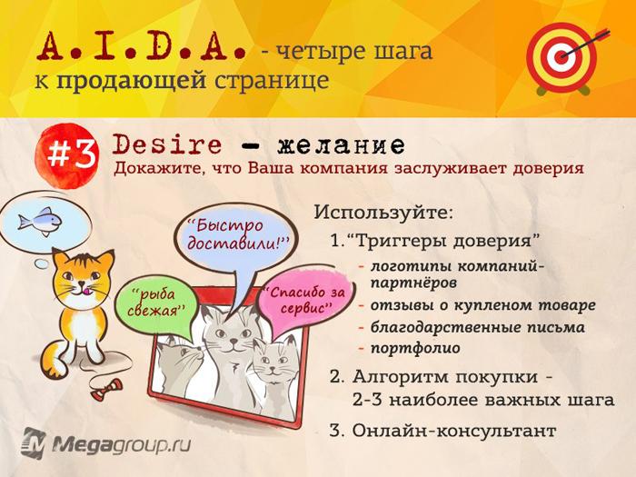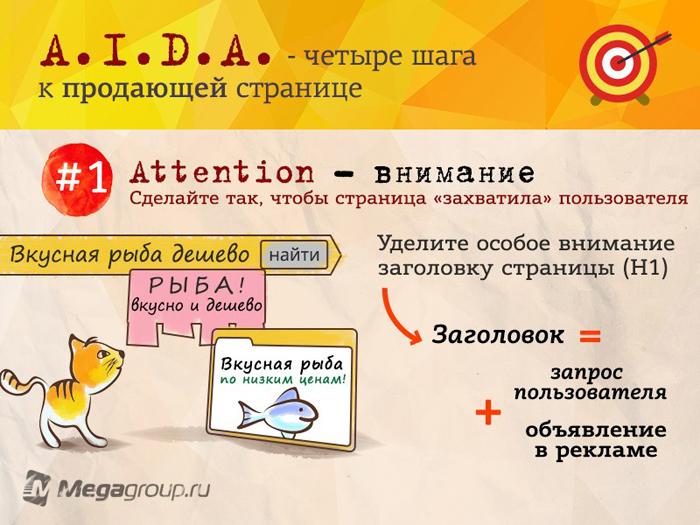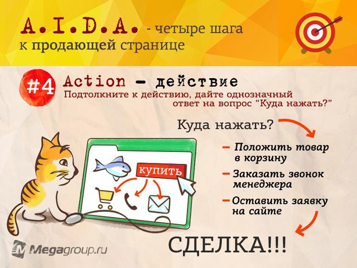 Старайтесь по возможности использовать принцип A.I.D.A. при построении страниц сайта. Мы подробно рассказывали о нём, а потому сейчас лишь кратко повторим самое главное. Четыре картинки наглядно показывают суть: